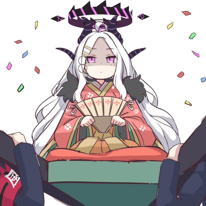 3girls ahoge alternate_costume armband blazer blue_archive carrying coat coat_on_shoulders commentary confetti cushion demon_girl demon_horns festival folding_fan fur-trimmed_coat fur_trim hair_ornament hairclip halo hand_fan hina_(blue_archive) hina_ningyou hinamatsuri holding holding_fan horns jacket japanese_clothes karaginu_mo kimono layered_clothes layered_kimono litter_(vehicle) long_hair long_sleeves looking_at_viewer multiple_girls name_connection out_of_frame parted_bangs ponytail prefect_team_member_(blue_archive) pun purple_eyes school_uniform shaded_face shooka sidelocks simple_background sitting sketch white_background white_hair