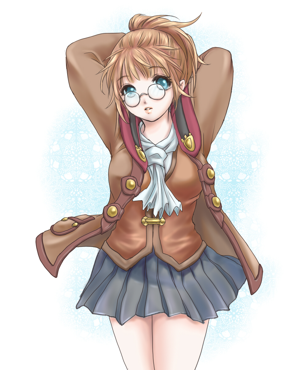 1girl arms_behind_head arms_up ascot adventurer_(ff11) blonde_hair blue_eyes breasts brown_coat brown_vest coat final_fantasy final_fantasy_xi glasses grey_skirt highres hume legs_together long_sleeves medium_breasts miniskirt open_clothes open_coat parted_lips pink_lips pleated_skirt ponytail rimless_eyewear round_eyewear sakutsuki scholar_(final_fantasy) short_hair skirt solo standing vest white_ascot