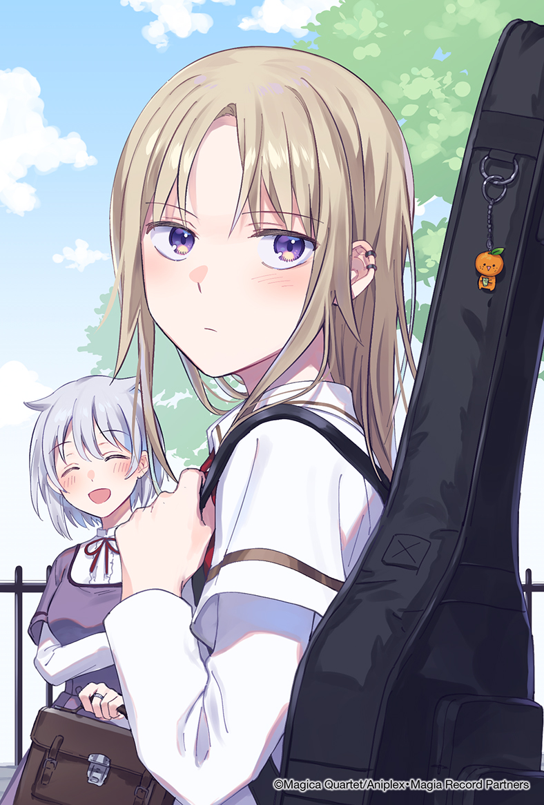2girls :d azusa_mifuyu bag blue_sky blush bow bowtie briefcase buttons center_frills closed_eyes closed_mouth cloud collared_shirt copyright_notice dot_nose ear_piercing frilled_shirt frills frown fuji_fujino grey_hair guitar_case hair_horns holding holding_bag instrument_case jewelry charm_(object) layered_sleeves long_hair long_sleeves looking_at_viewer magia_record:_mahou_shoujo_madoka_magica_gaiden mahou_shoujo_madoka_magica mizuna_girls'_academy_school_uniform multiple_girls neck_ribbon official_art open_mouth outdoors parted_bangs piercing purple_eyes purple_shirt purple_skirt red_bow red_bowtie ribbon ring sakae_general_school_uniform school_briefcase school_uniform shirt shirt_under_shirt short_hair short_over_long_sleeves short_sleeves skirt sky smile tree upper_body white_shirt wing_collar yukino_kanae