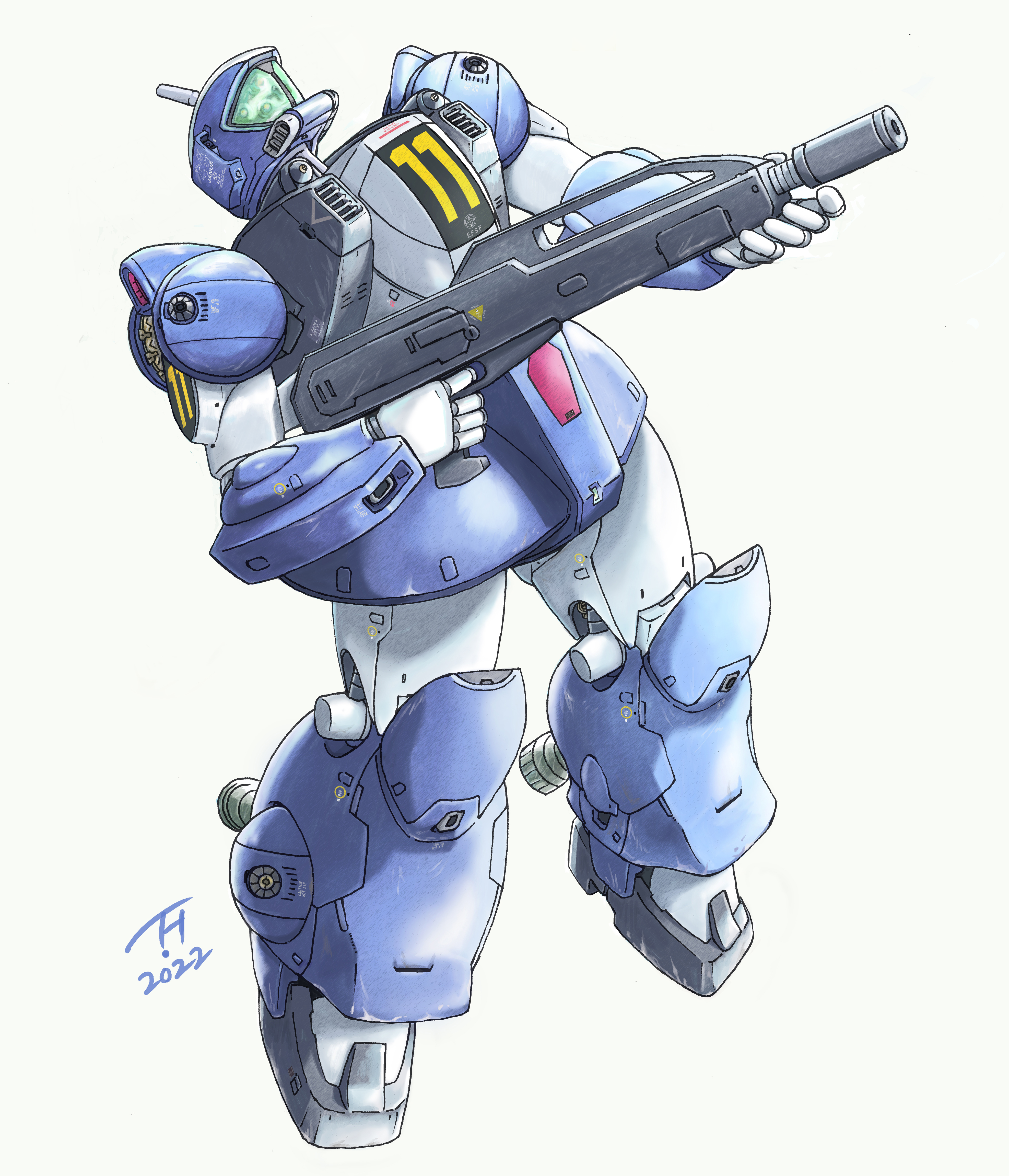 absurdres dated full_body ginga_hyouryuu_vifam gun highres holding holding_gun holding_weapon kujira_gunsou mecha mecha_focus mecha_request no_humans robot simple_background standing torunfam weapon white_background