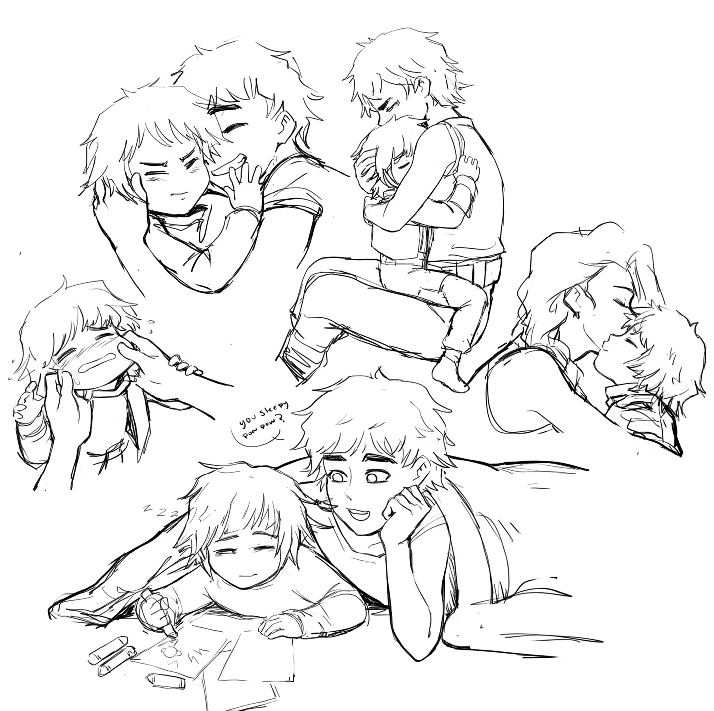 aged_down arcane:_league_of_legends bare_shoulders blush closed_eyes english_text greyscale grin highres hug jinx_(league_of_legends) league_of_legends lying monochrome mooch_(uhmooch) on_stomach pants powder_(arcane) shirt short_hair siblings sisters sitting smile speech_bubble teeth vi_(league_of_legends)