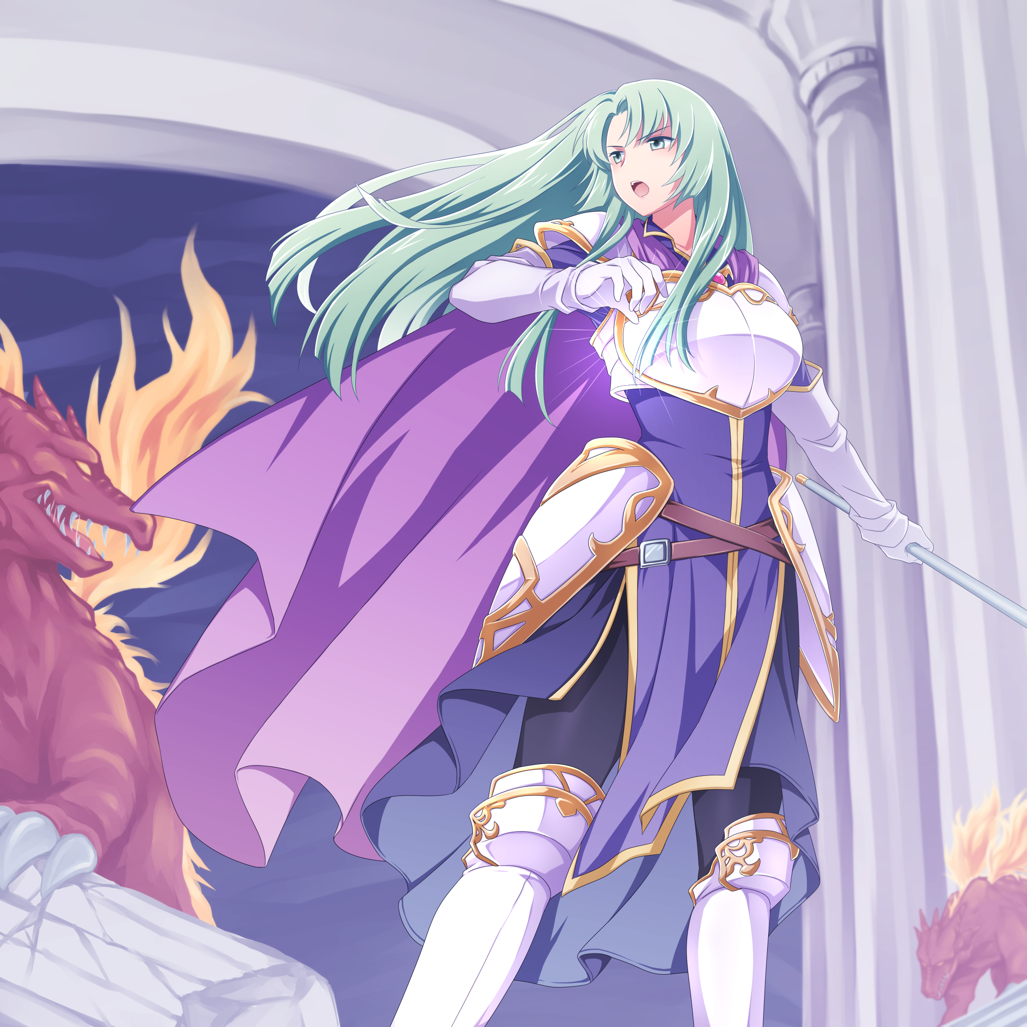 1girl :o armor armored_boots black_pants boots breastplate cape cecilia_(fire_emblem) dragon dress elbow_gloves fire fire_emblem fire_emblem:_the_binding_blade gloves green_hair ham_pon highres holding holding_staff long_hair nintendo pants purple_cape purple_dress solo staff v-shaped_eyebrows white_armor white_boots white_gloves
