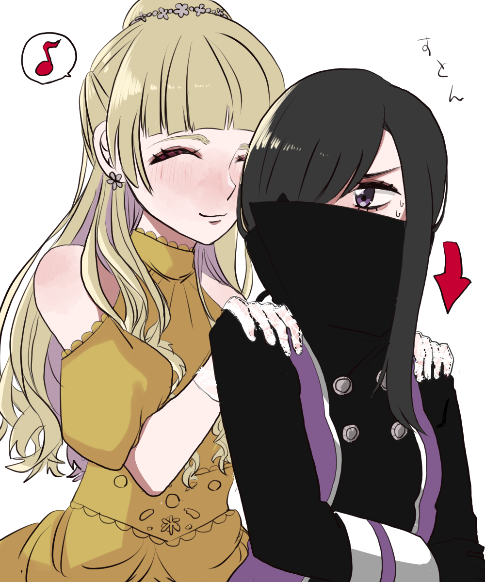 2girls arrow_(symbol) black_hair blonde_hair cloak_covering_mouth closed_eyes hair_over_one_eye highres kanisuka_rita looking_at_another looking_back momohana multiple_girls musical_note ohsama_sentai_king-ohger purple_eyes ran_himeno simple_background spoken_musical_note super_sentai sweat white_background