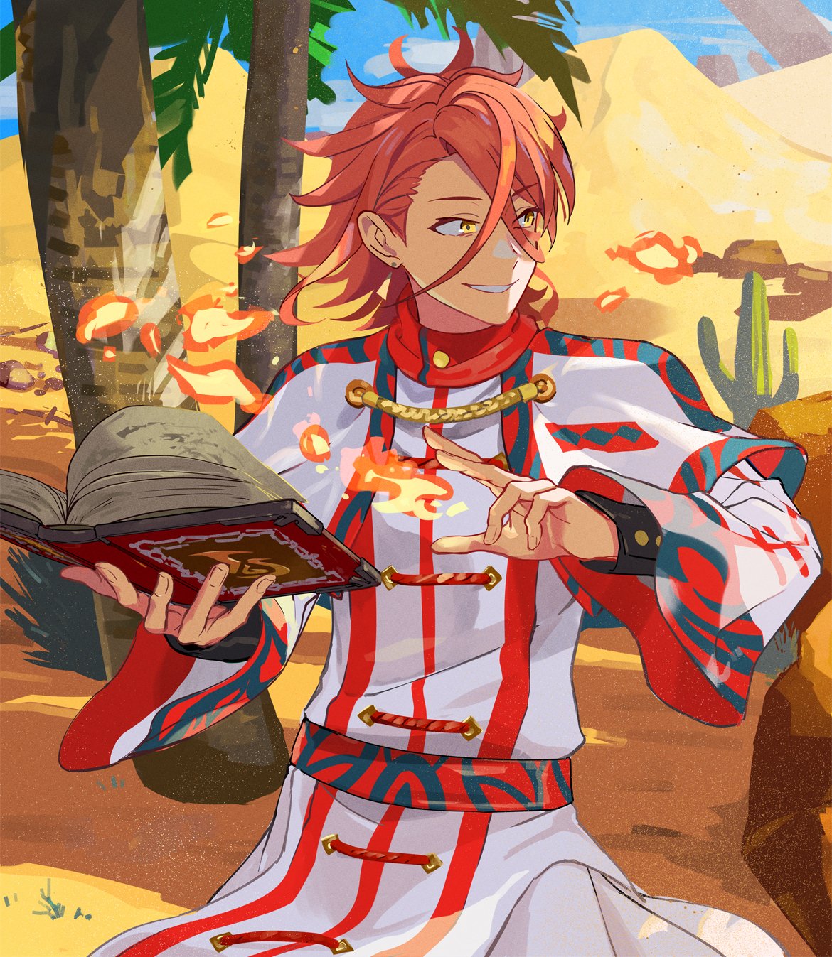 1boy book cactus desert fighting fire fire_emblem fire_emblem_engage fireball highres holding holding_book magic mikami nintendo orange_hair palm_tree pandreo_(fire_emblem) priest pyrokinesis robe sand smile tree white_robe yellow_eyes