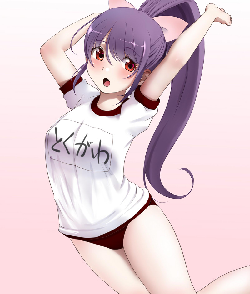 1girl :o arms_up blush breasts buruma commentary_request gradient_background gym_shirt gym_uniform hair_ribbon high_ponytail kozue_akari long_hair looking_at_viewer medium_breasts open_mouth pink_background pink_ribbon ponytail puffy_short_sleeves puffy_sleeves purple_hair red_buruma red_eyes ribbon sengoku_otome shirt short_sleeves solo tokugawa_ieyasu_(sengoku_otome) very_long_hair white_background white_shirt
