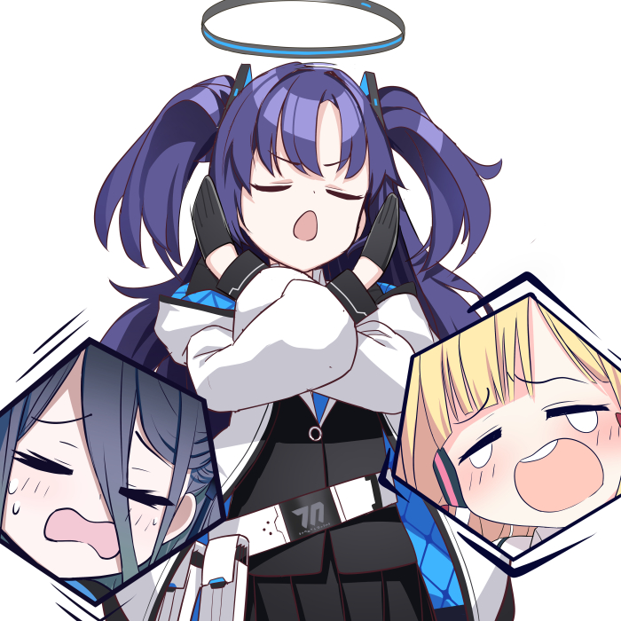 3girls aris_(blue_archive) belt black_gloves black_hair black_jacket black_skirt blonde_hair blue_archive blue_necktie closed_eyes crying gloves hair_between_eyes halo jacket long_sleeves momoi_(blue_archive) multiple_girls necktie open_clothes open_jacket open_mouth parted_bangs pleated_skirt puffy_long_sleeves puffy_sleeves purple_hair shooka simple_background skirt sweat tearing_up tears twintails two_side_up v-shaped_eyebrows wavy_mouth white_background white_jacket x_arms yuuka_(blue_archive)