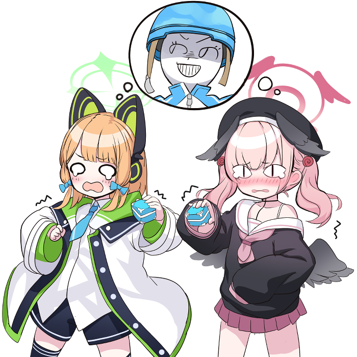 <|>_<|> 2girls beret black_headwear black_shirt black_shorts black_thighhighs black_wings blue_archive blue_headwear blue_necktie blush collared_shirt doodle_sensei_(blue_archive) dress_shirt feathered_wings flower hair_flower hair_ornament halo hat head_wings helmet holding hood hood_down hooded_jacket jacket koharu_(blue_archive) long_sleeves low_wings midori_(blue_archive) multiple_girls necktie nose_blush open_clothes open_jacket open_mouth parted_lips pink_hair pleated_skirt puffy_long_sleeves puffy_sleeves purple_skirt red_flower red_rose rose sensei_(blue_archive) shirt shooka short_shorts shorts simple_background skirt sleeves_past_fingers sleeves_past_wrists speech_bubble teardrop thighhighs thought_bubble trembling twintails wavy_mouth white_background white_jacket white_shirt wings