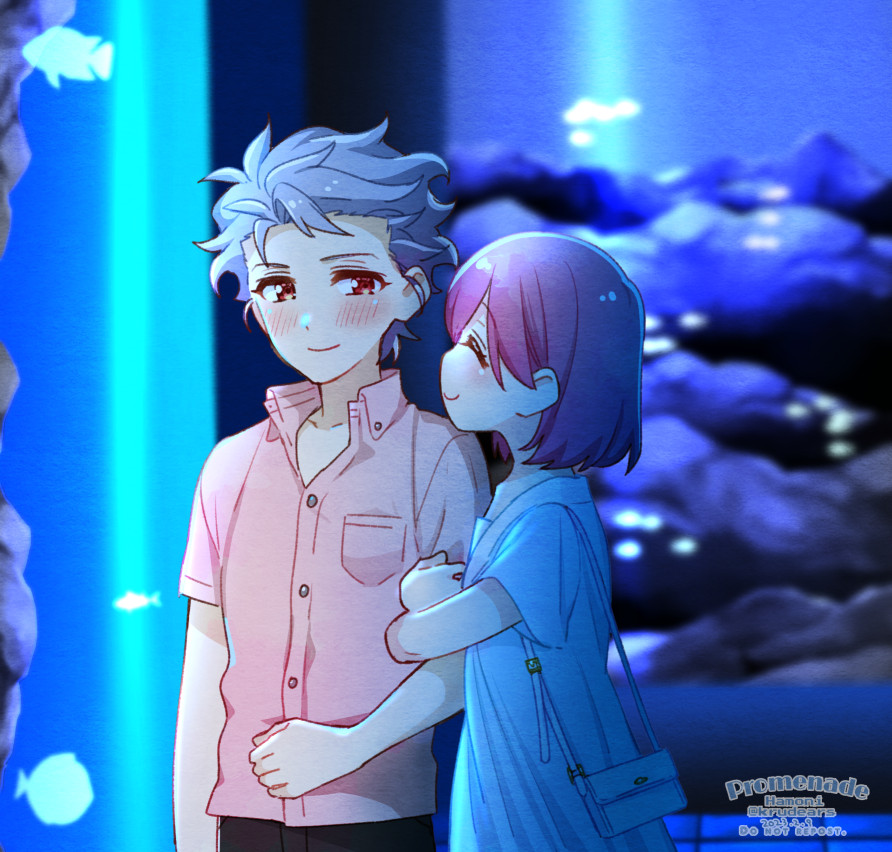 1boy 1girl aquarium artist_name bag black_pants blush bob_cut closed_eyes collared_shirt couple dress fish grey_hair holding_another's_arm indoors krudears looking_at_another pants pink_hair pink_shirt protagonist_(tokimemo_gs3) red_eyes shirt shitara_seiji short_hair short_sleeves shoulder_bag smile tokimeki_memorial tokimeki_memorial_girl's_side tokimeki_memorial_girl's_side_3rd_story twitter_username upper_body white_dress