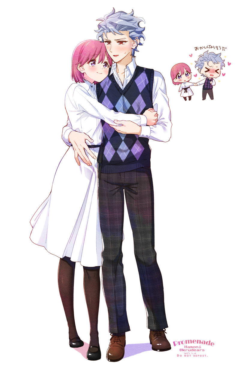 >_< 1boy 1girl argyle_clothes argyle_sweater arm_around_another's_waist artist_name black_footwear black_pantyhose blush bob_cut brown_footwear chibi collared_dress collared_shirt couple dress dress_shoes full_body grey_hair heart hetero highres holding_hands hug krudears long_sleeves mary_janes pants pantyhose parted_lips pink_hair plaid_clothes plaid_pants protagonist_(tokimemo_gs3) purple_eyes red_eyes shirt shitara_seiji shoes short_hair smile sweatdrop sweater sweater_vest tokimeki_memorial tokimeki_memorial_girl's_side tokimeki_memorial_girl's_side_3rd_story twitter_username white_background white_dress white_shirt