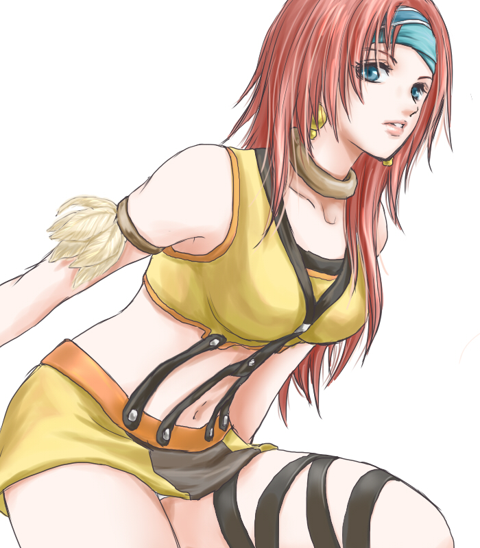 1girl armlet bare_shoulders blue_eyes blue_headband breasts brown_skirt collarbone crop_top earrings eyelashes feathers final_fantasy final_fantasy_xi headband hume jewelry large_breasts lion_(ff11) long_hair miniskirt navel neck_ring parted_lips pink_lips red_hair sakutsuki simple_background skirt solo thigh_strap two-tone_skirt white_background white_feathers yellow_skirt