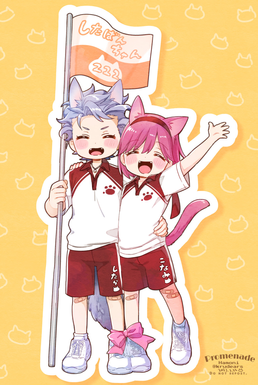 1boy 1girl animal_ears arm_around_another's_waist artist_name bandaid bandaid_on_leg blush bob_cut cat_boy cat_day cat_ears cat_girl cat_tail closed_eyes fangs flag full_body grey_hair highres holding holding_flag kemonomimi_mode krudears open_mouth pink_hair pink_ribbon protagonist_(tokimemo_gs3) red_shorts ribbon shitara_seiji short_hair short_sleeves shorts smile tail tokimeki_memorial tokimeki_memorial_girl's_side tokimeki_memorial_girl's_side_3rd_story twitter_username waving white_footwear