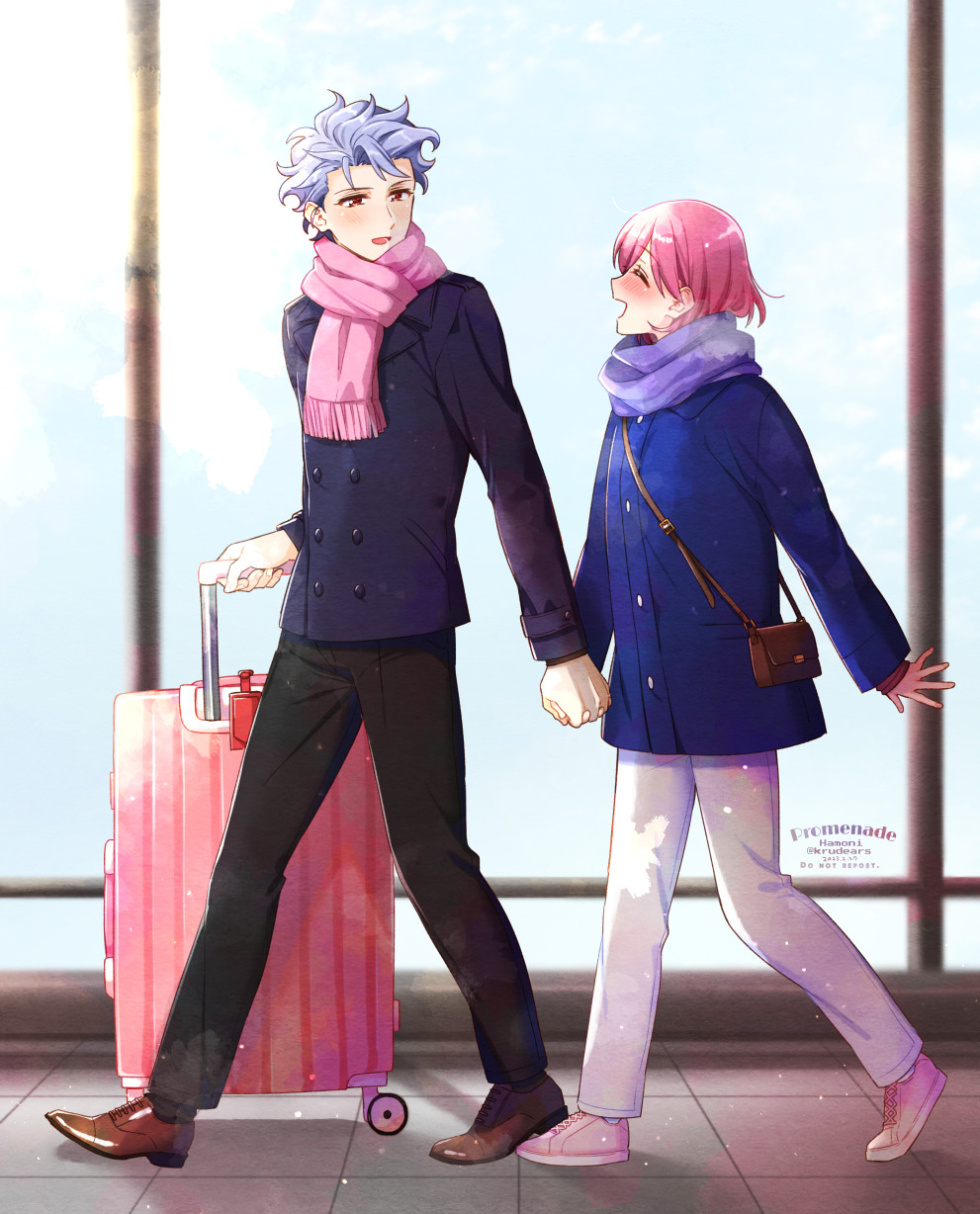 1boy 1girl artist_name bag black_pants blue_coat blue_scarf blush bob_cut brown_footwear closed_eyes coat couple dress_shoes full_body grey_hair hetero highres holding_hands holding_luggage krudears long_sleeves looking_at_another open_mouth pants pink_hair pink_scarf pink_shoes protagonist_(tokimemo_gs3) red_eyes rolling_suitcase scarf shitara_seiji shoes short_hair shoulder_bag smile suitcase tile_floor tiles tokimeki_memorial tokimeki_memorial_girl's_side tokimeki_memorial_girl's_side_3rd_story twitter_username walking white_pants