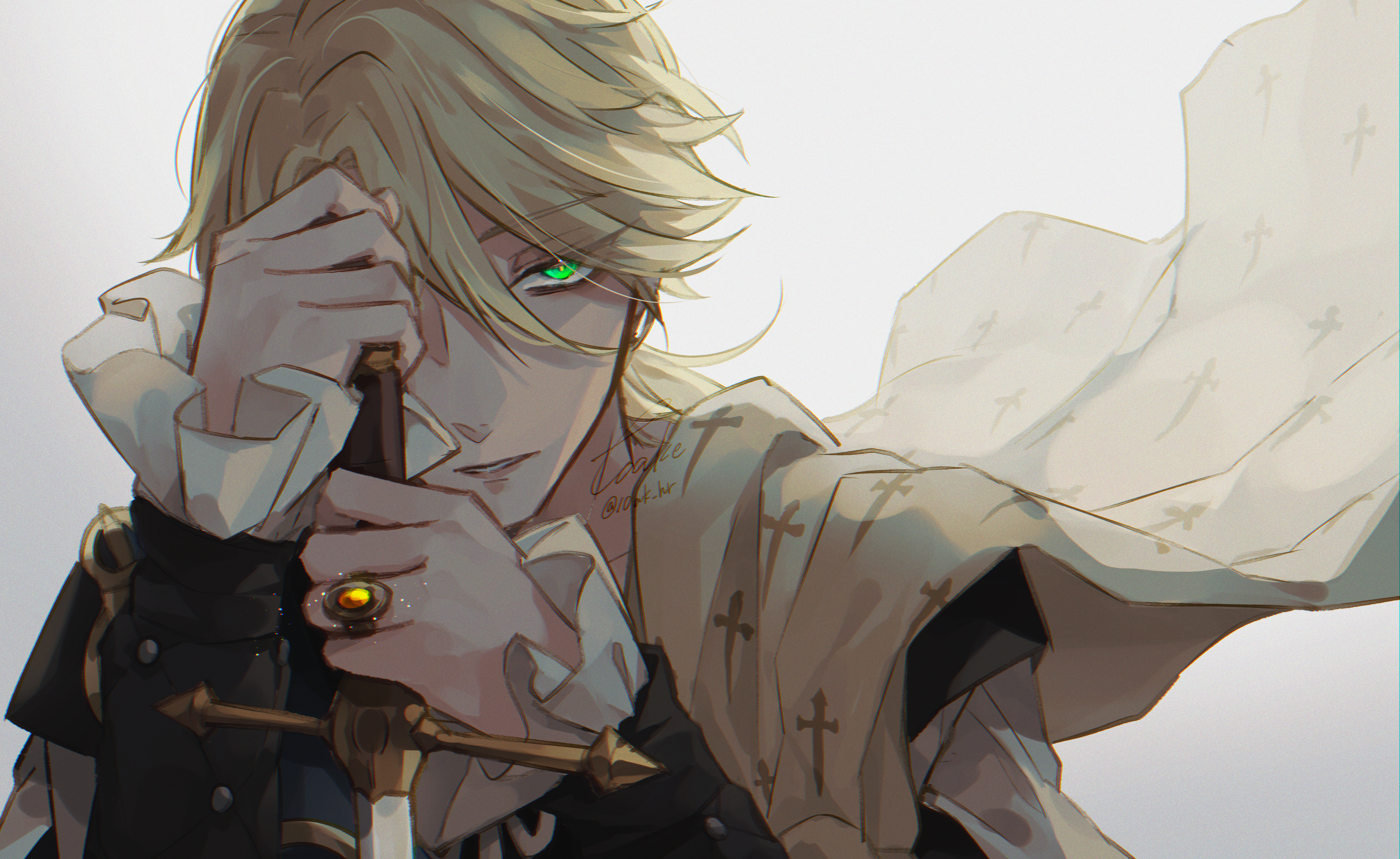 1boy absurdres aesop_carl aesop_carl_(hamlet) black_jacket blonde_hair cape cross cross_print frilled_sleeves frills green_eyes hair_between_eyes hand_on_hilt highres holding holding_sword holding_weapon identity_v jacket jewelry long_hair looking_at_viewer low_ponytail male_focus official_alternate_costume one_eye_covered parted_lips ponytail ring shirt simple_background solo sword toalke_knell upper_body weapon white_background white_shirt yellow_cape