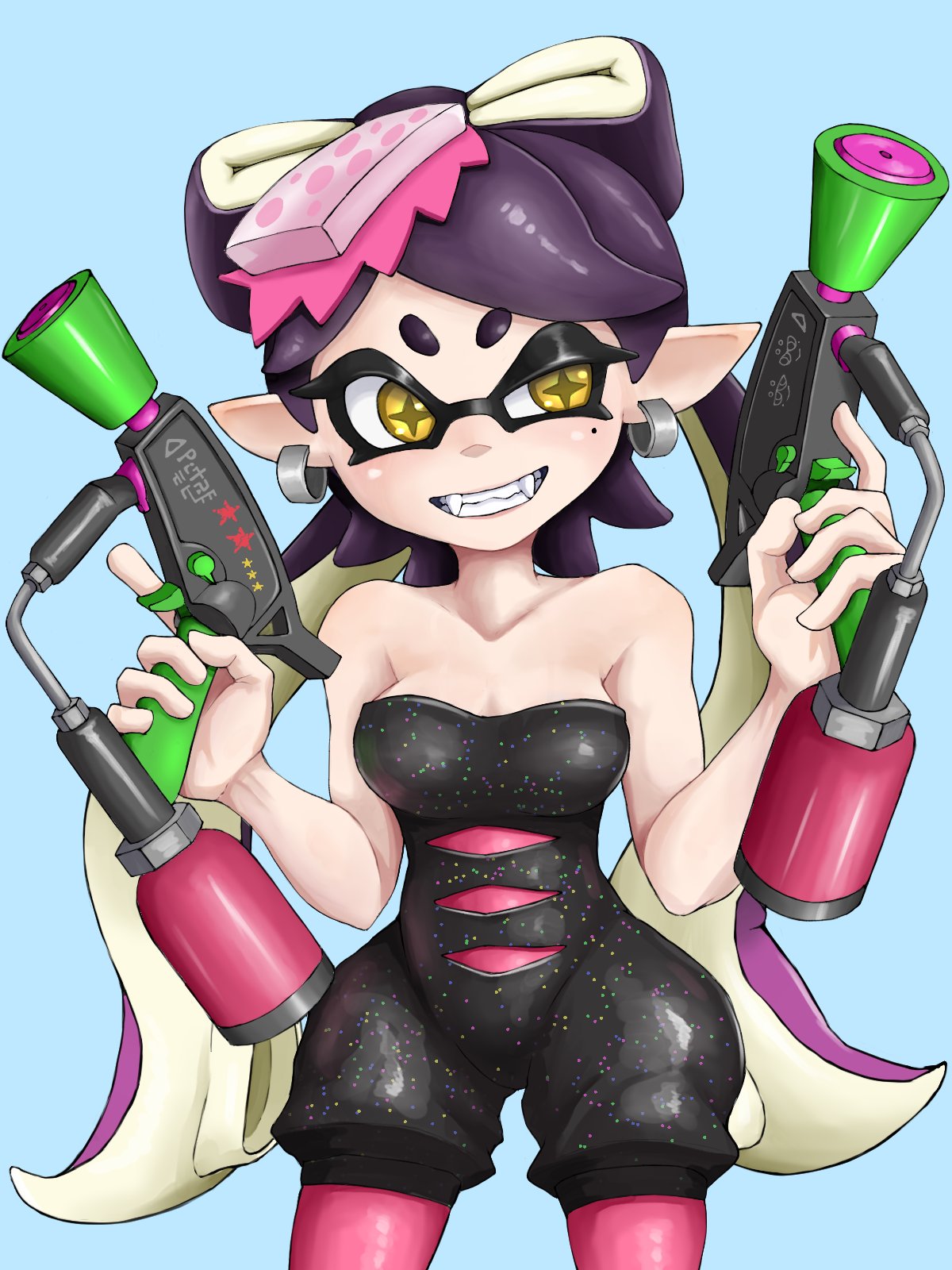 1girl bare_shoulders breasts callie_(splatoon) earrings gun highres jewelry medium_breasts nintendo pointy_ears sheoknight sleeveless splatoon_(series) tentacle_hair weapon yellow_eyes