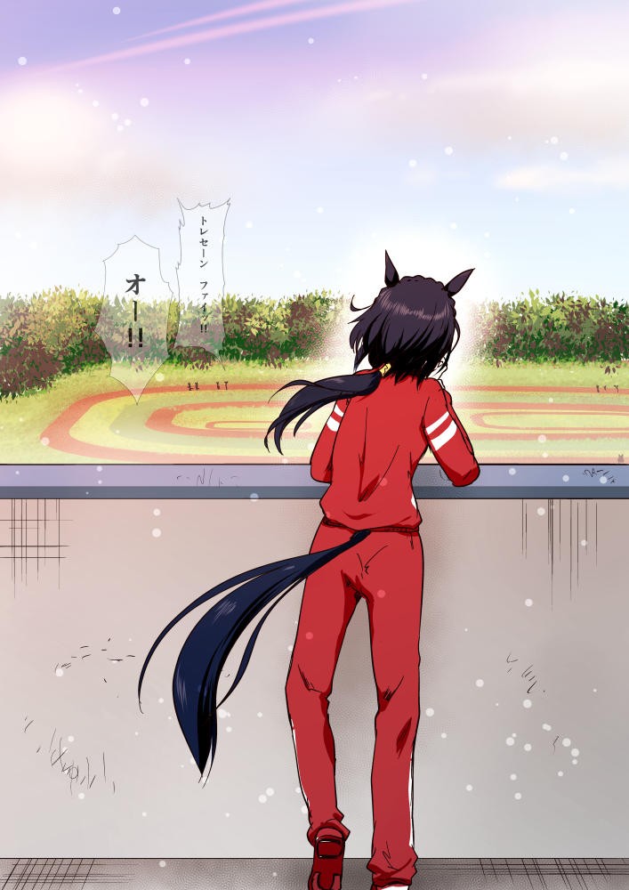 1girl animal_ears black_hair from_behind horse_ears horse_girl horse_tail hoxutixu jacket kin'iro_ryotei_(umamusume) long_hair low_ponytail outdoors pants ponytail red_footwear red_jacket red_pants solo tail tracen_training_uniform track_jacket track_pants umamusume