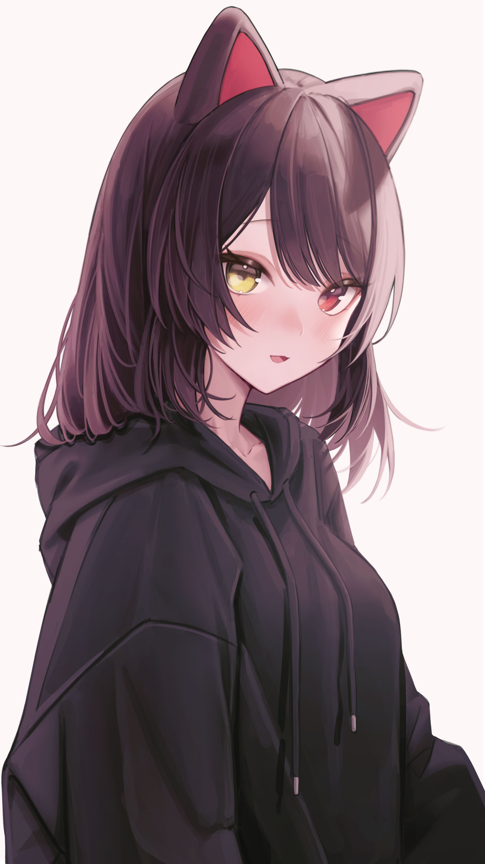1girl :d absurdres animal_ears black_hoodie blush brown_hair drawstring heterochromia highres hood hood_down hoodie inui_toko long_hair long_sleeves looking_at_viewer nijisanji oni0417 open_mouth red_eyes simple_background smile solo upper_body virtual_youtuber white_background yellow_eyes
