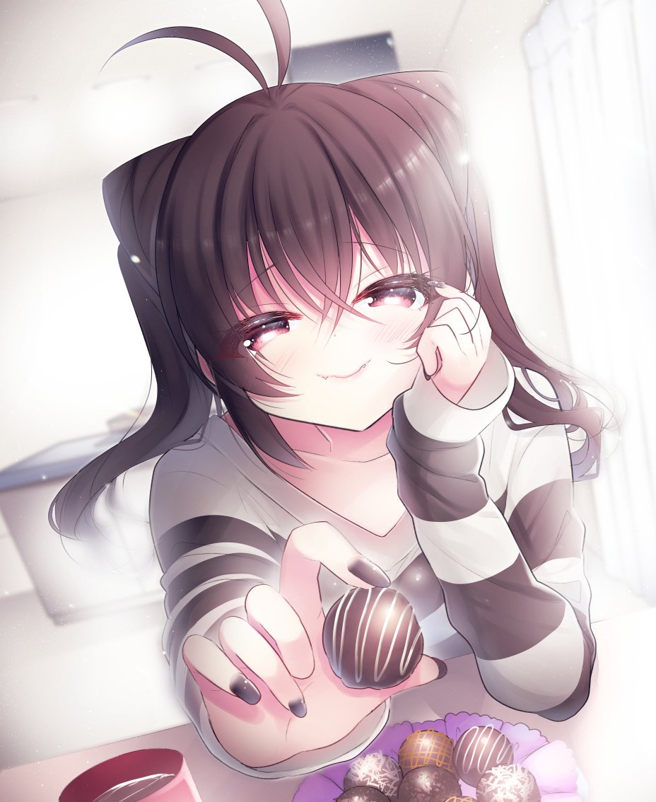 1girl antenna_hair black_nails blurry blurry_background brown_hair chocolate collarbone crossed_bangs cup curtains food hano_haruka holding holding_chocolate holding_food looking_at_viewer pink_eyes shirt siscon_ani_to_brocon_imouto_ga_shoujiki_ni_nattara striped_clothes striped_shirt table twintails uta_(siscon_ani_to_brocon_imouto_ga_shoujiki_ni_nattara_) valentine