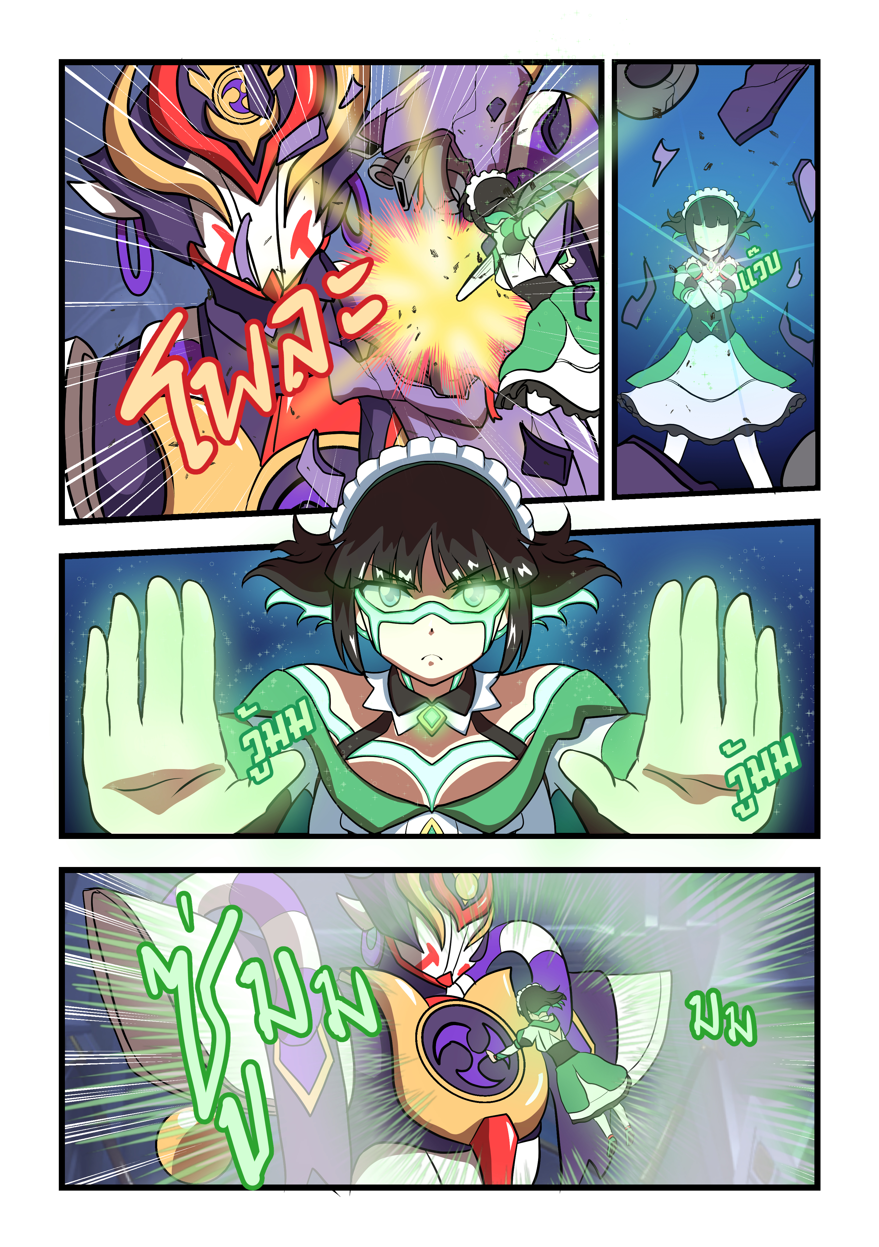 1girl absurdres atawatsho black_hair blue_eyes breaking comic commentary english_commentary english_text genshin_impact glowing glowing_tattoo gundam gundam_unicorn highres katheryne_(genshin_impact) long_sleeves mecha medium_hair mitsudomoe_(shape) nt-d parted_bangs punching robot scaramouche_(genshin_impact) scaramouche_(kabukimono)_(genshin_impact) sidelocks tattoo tomoe_(symbol)