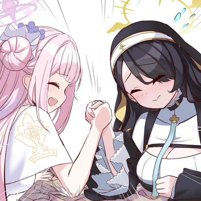 2girls arm_wrestling black_hair blue_archive blunt_bangs breasts broken capelet cleavage cleavage_cutout clothing_cutout commentary_request habit hair_bun hair_ornament hair_over_one_eye halo hinata_(blue_archive) holding_hands large_breasts long_hair long_sleeves looking_at_another medium_breasts mika_(blue_archive) multiple_girls nun nun_headdress one_side_up pink_hair shooka sidelocks simple_background single_side_bun white_background wide_sleeves
