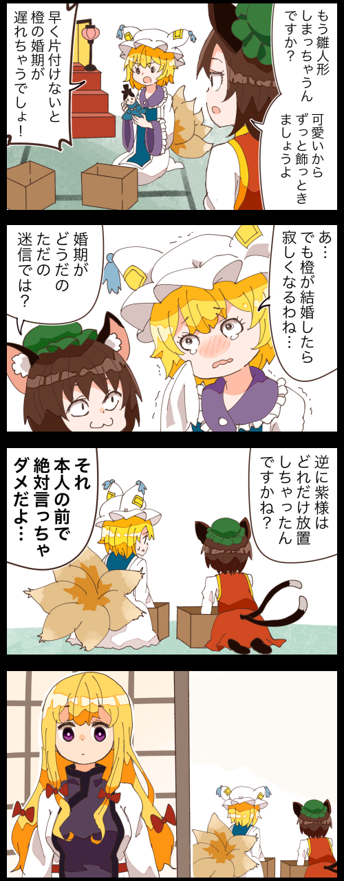 4koma :3 animal_hat box cat_tail chen comic commentary_request doll figure fox_tail handkerchief hat highres jetto_komusou lamp mob_cap multiple_tails tail touhou translation_request yakumo_ran yakumo_yukari