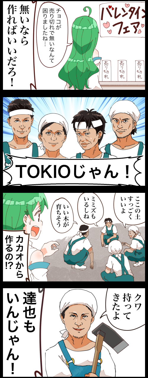 1girl 4koma 5boys comic commentary_request headscarf headband highres hoe jetto_komusou joshima_shigeru kochiya_sanae kokubun_taichi matsuoka_masahiro multiple_boys nagase_tomoya overalls suspenders the_tetsuwan_dash!! tokio_(music) touhou translation_request yamaguchi_tatsuya