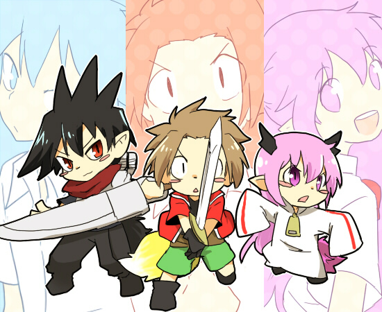 1girl 2boys alba_(senyuu) armor black_footwear black_hair blush brown_hair cat_tail green_shorts head_wings holding holding_sword holding_weapon long_hair long_sleeves looking_at_viewer multiple_boys pink_eyes pink_hair pointy_ears red_eyes red_scarf ross_(senyuu) ruki_(senyuu) scarf sen'yuu. shorts shoulder_armor sleeves_past_fingers sleeves_past_wrists ss1313 sword tail weapon wings
