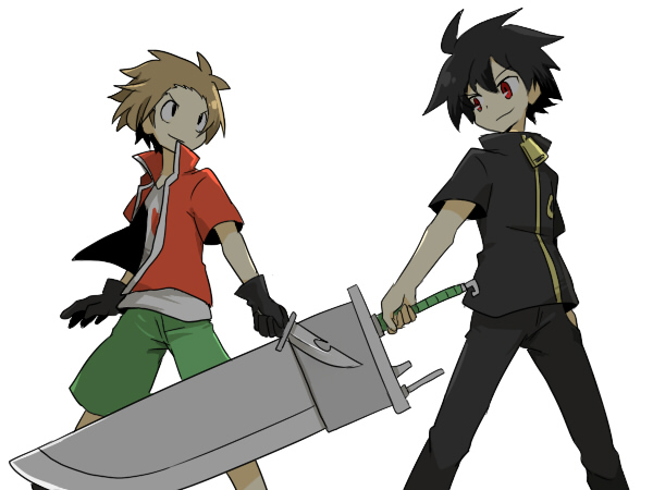 2boys alba_(senyuu) black_gloves black_hair brown_hair gloves green_shorts holding holding_knife holding_sword holding_weapon knife looking_at_another male_focus multiple_boys red_eyes ross_(senyuu) sen'yuu. shorts simple_background ss1313 sword weapon white_background