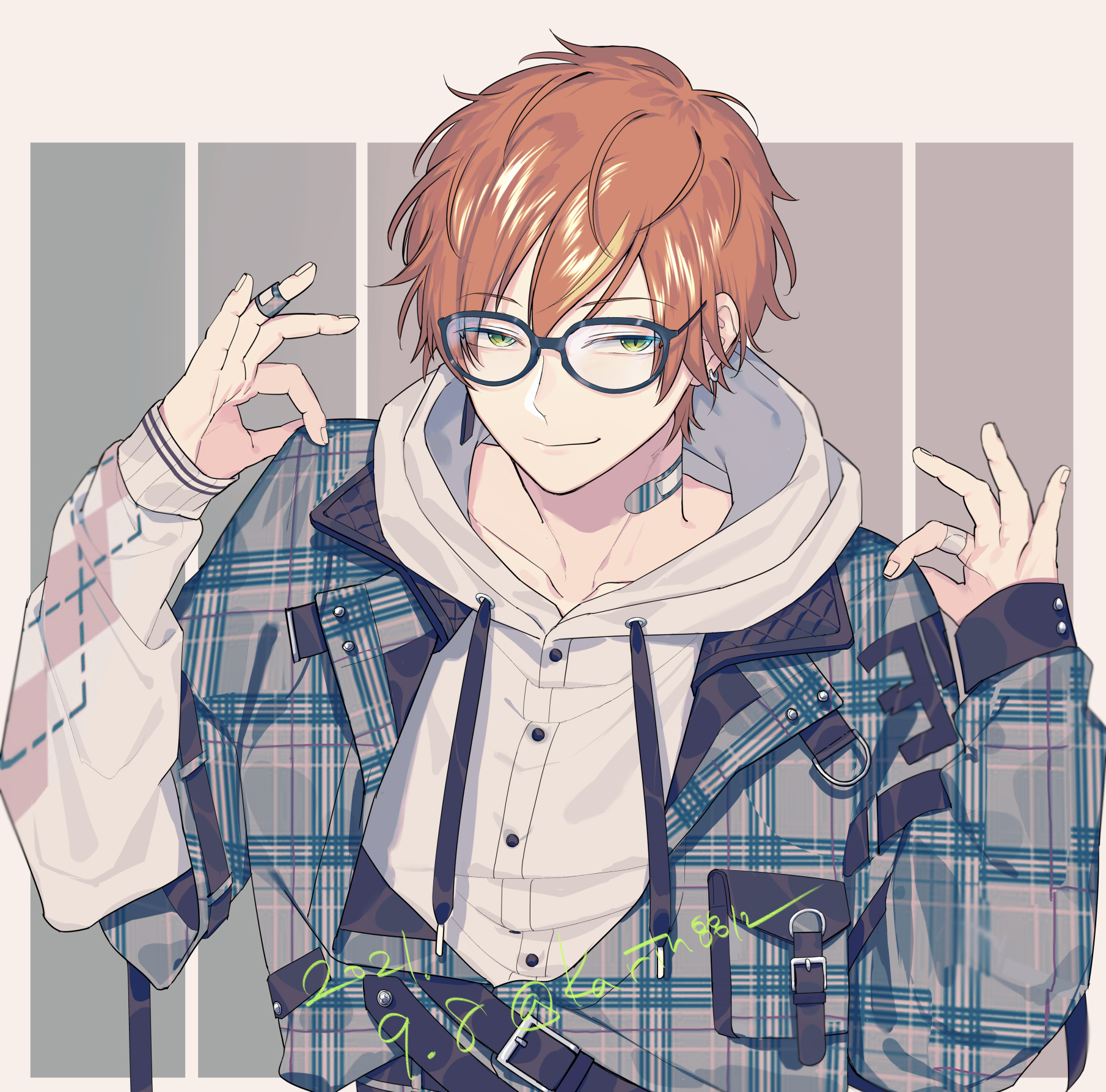 1boy asymmetrical_sleeves bandaid bandaid_on_neck bespectacled black_jacket blue-framed_eyewear buckle buttons closed_mouth collarbone collared_jacket commentary dated dizzy_trap_(project_sekai) drawstring english_commentary fingernails glasses green_eyes grey_background grey_jacket hair_between_eyes highres hood hood_down hoodie jacket layered_sleeves long_sleeves male_focus mismatched_sleeves ok_sign orange_hair plaid_clothes plaid_jacket pocket project_sekai shinonome_akito short_hair short_over_long_sleeves short_sleeves sohu solo twitter_username two-sided_fabric two-sided_jacket two-tone_background upper_body white_background white_hoodie