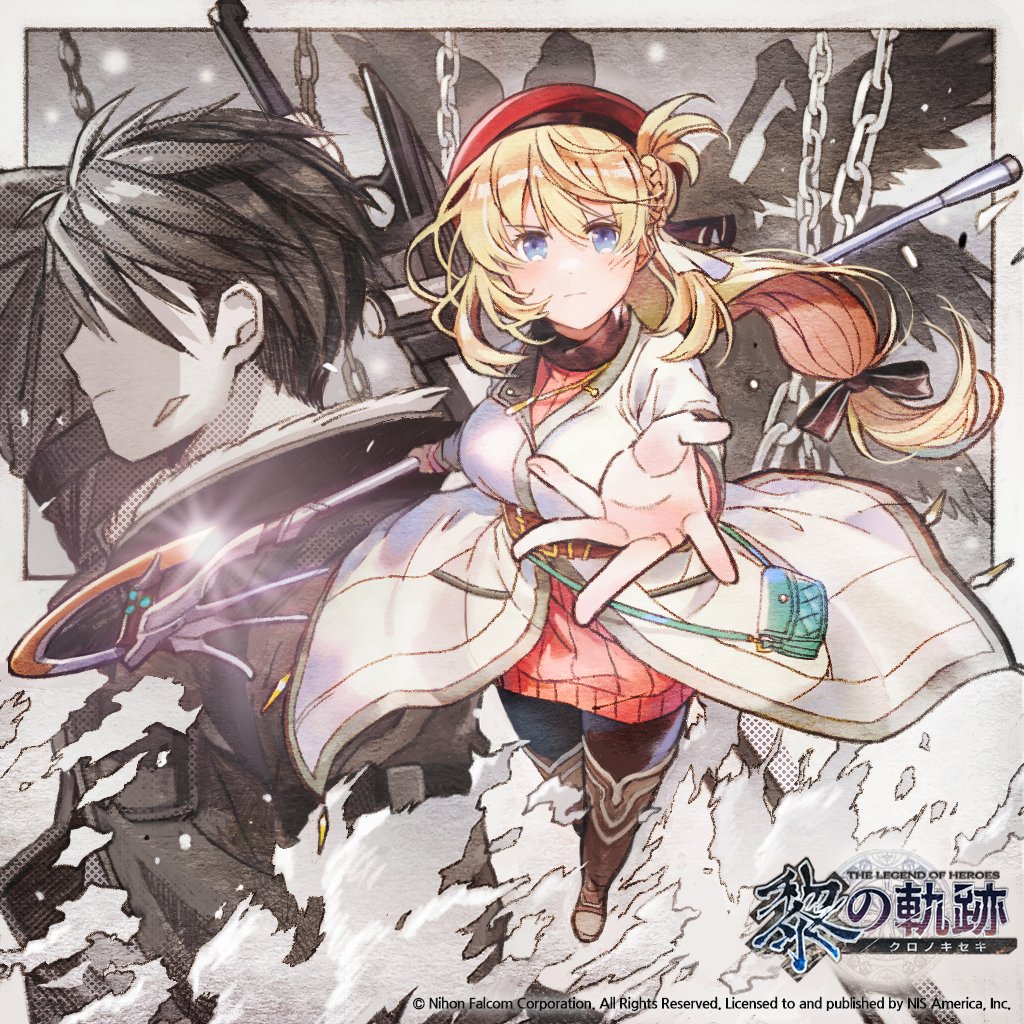 1boy 1girl agnes_claudel bag blonde_hair blue_eyes coat eiyuu_densetsu falcom handbag hat holding holding_staff holding_weapon kuro_no_kiseki_(series) kuro_no_kiseki_i long_hair looking_at_viewer official_art open_hand staff van_arkride weapon wolfyinthecity