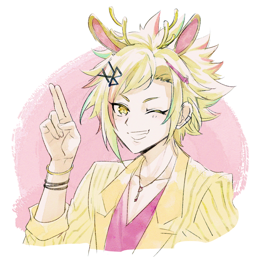 1boy animal_ears blonde_hair blue_hair jackalope_boy jyaroppu_(show_by_rock!!) looking_at_viewer male_focus mel6969 multicolored_background multicolored_hair one_eye_closed pink_background pink_hair rabbit_boy rabbit_ears short_hair show_by_rock!! solo white_background yellow_eyes