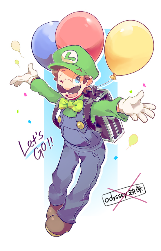 1boy ;d arms_up backpack bag balloon blue_background blue_eyes blue_overalls blue_pants bow bowtie brown_bag brown_hair brown_shoes buttons commentary_request confetti english_text facial_hair full_body gloves green_bow green_bowtie green_hat green_shirt hat kayako_(bimabima) long_sleeves looking_at_viewer luigi luigi_(balloon_world) male_focus mario_(series) mustache nintendo one_eye_closed open_mouth overalls pants shirt shoes short_hair simple_background smile solo super_mario_odyssey teeth upper_teeth_only white_background white_gloves