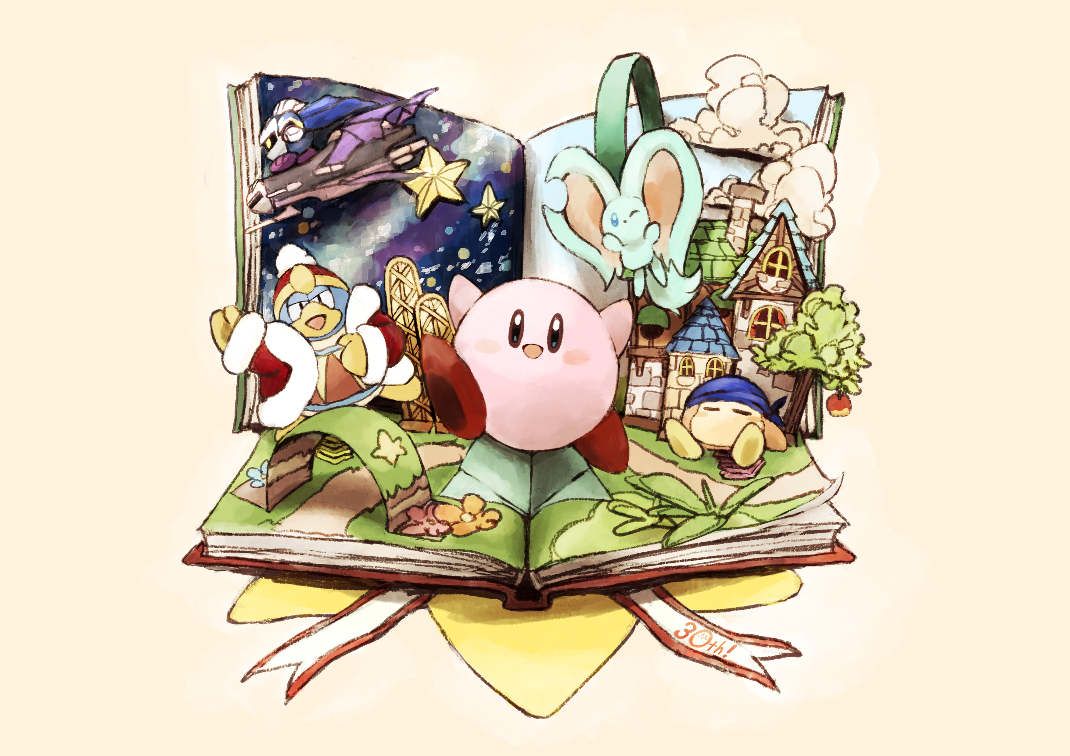 absurdres apple arms_up blue_headwear book building food fruit full_body grass highres kirby kirby's_dream_land kirby_(series) koto7suke looking_at_viewer nintendo no_humans open_book open_mouth pop-up_book tagme tree