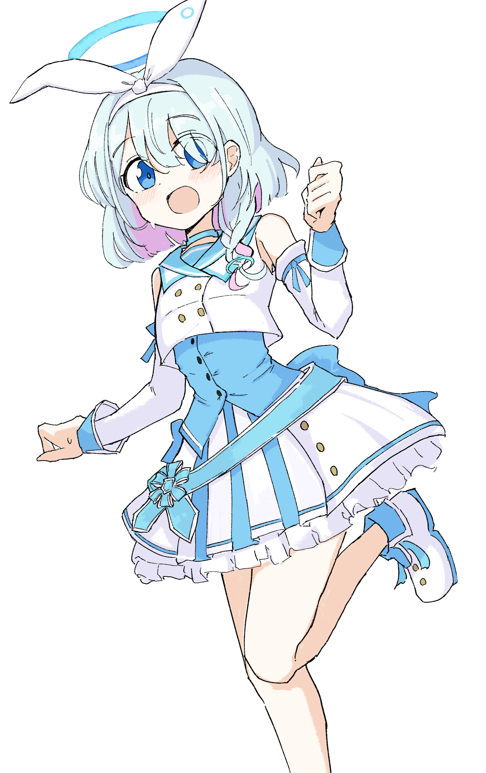 1girl absurdres arona_(blue_archive) bare_legs bare_shoulders blue_archive blue_eyes blue_hair bone_hiko halo highres idol looking_at_viewer mischievous_straight_uniform_(blue_archive) pink_hair shirt simple_background skirt thighs white_background white_shirt white_skirt