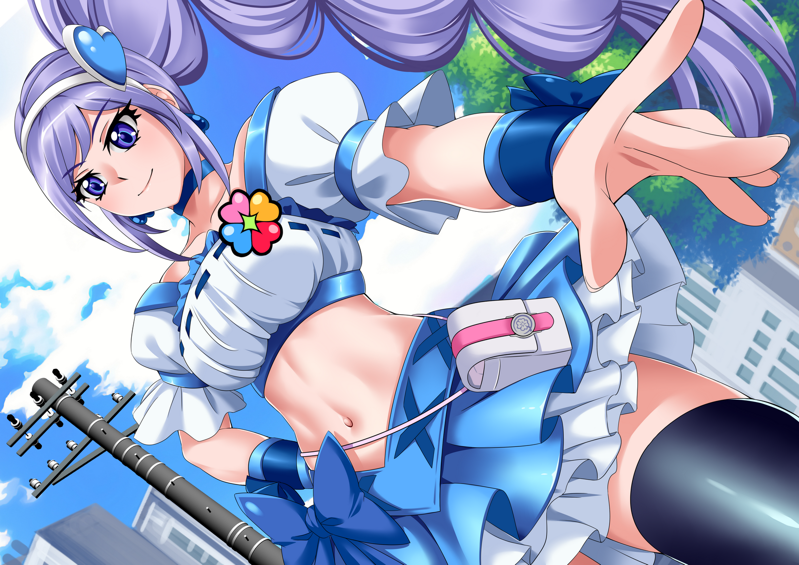 aono_miki bandeau black_thighhighs blue_choker blue_skirt breasts building choker cloud clover cure_berry day fresh_precure! frills hairband highres house long_hair medium_breasts navel outdoors pouch power_lines precure purple_eyes purple_hair road short_sleeves skirt sky street thighhighs town utility_pole very_long_hair wavelevel5