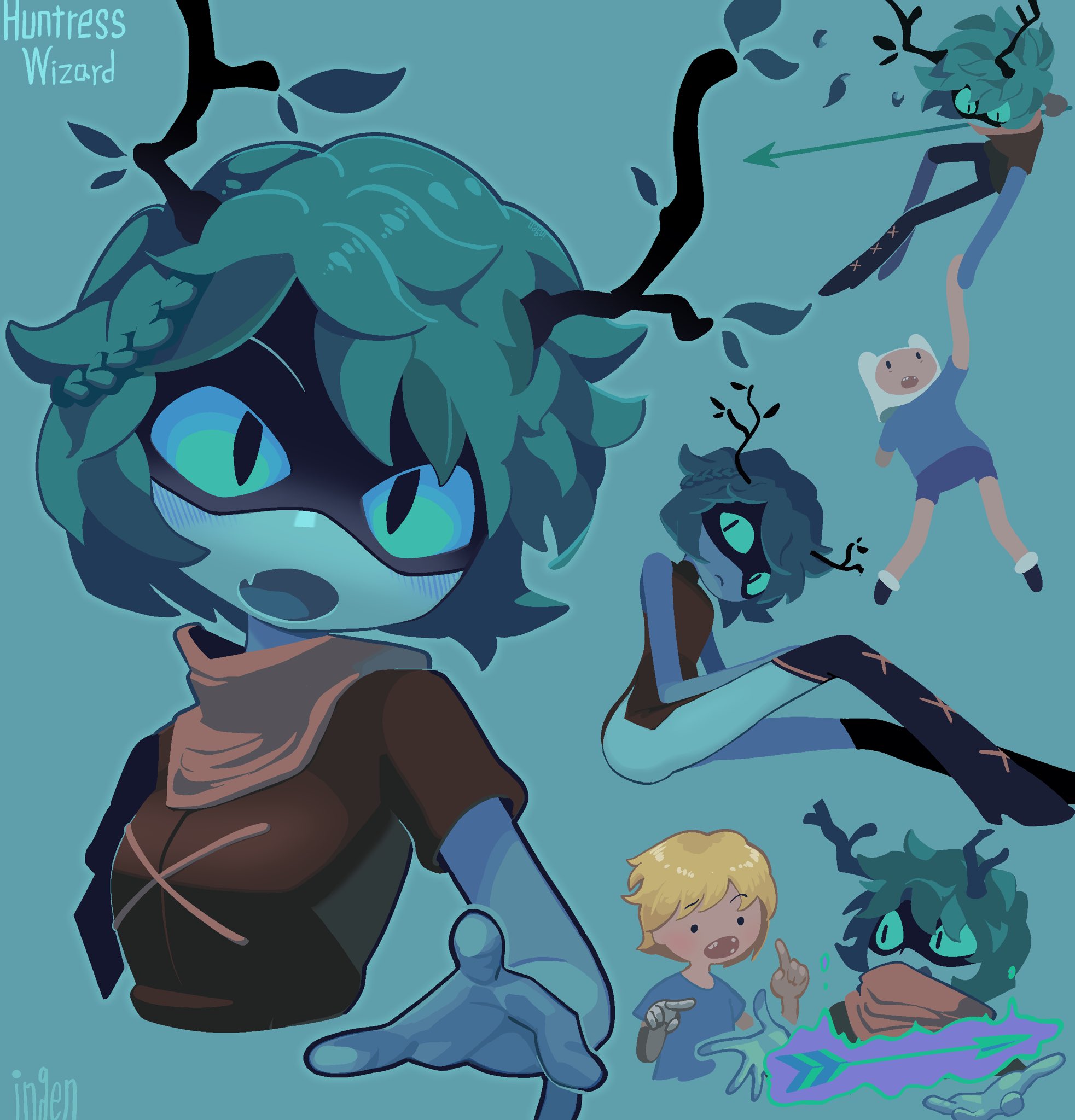 1girl adventure_time alternate_costume aqua_eyes aqua_skin arrow_(projectile) artist_name black_mask blonde_hair blue_background blue_shirt blush boots braid brown_dress brown_tunic colored_skin commentary dress english_commentary eye_mask fang finn_the_human green_hair hair_branch highres huntress_wizard ingen_(ingen-godzzila) leaf looking_at_viewer mask mechanical_arms multiple_views open_mouth plant_hair shirt short_hair simple_background single_mechanical_arm skin_fang sleeveless sleeveless_dress slit_pupils solo_focus toon_(style) tunic upper_body