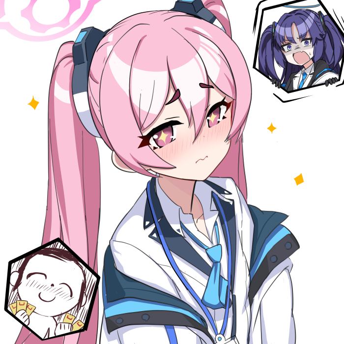 1boy 2girls blazer blue_archive card collared_shirt commentary_request doodle_sensei_(blue_archive) hair_between_eyes hair_ornament halo holding holding_card hood hooded_coat jacket koyuki_(blue_archive) lanyard long_hair long_sleeves looking_at_viewer multiple_girls necktie pink_eyes pink_hair purple_eyes purple_hair school_uniform sensei_(blue_archive) shirt shooka sidelocks simple_background spoken_character symbol-shaped_pupils tearing_up twintails two_side_up white_background yuuka_(blue_archive)