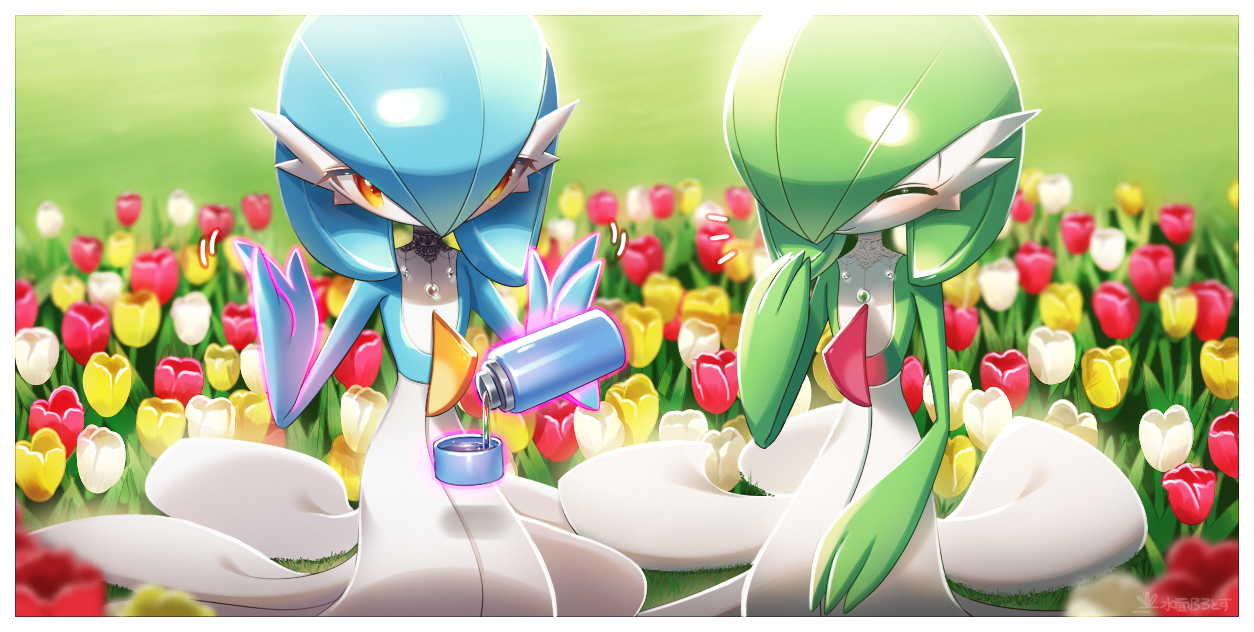 2girls ^_^ alternate_color artist_name black_choker blue_hair blue_skin blurry blush bob_cut border choker closed_eyes closed_mouth colored_skin day depth_of_field female_focus field flat_chest flower flower_field gardevoir gen_3_pokemon grass green_hair green_skin hair_between_eyes hair_over_one_eye hand_to_own_mouth hand_up hands_up happy lace lace_choker lotosu mega_stone motion_lines multicolored_skin multiple_girls nintendo notice_lines one_eye_covered orange_eyes outdoors outline pink_outline pokemon pokemon_(creature) pouring red_flower red_tulip shiny_and_normal shiny_pokemon short_hair signature sitting smile telekinesis thermos tulip two-tone_skin water white_border white_choker white_flower white_skin white_tulip yellow_flower yellow_tulip