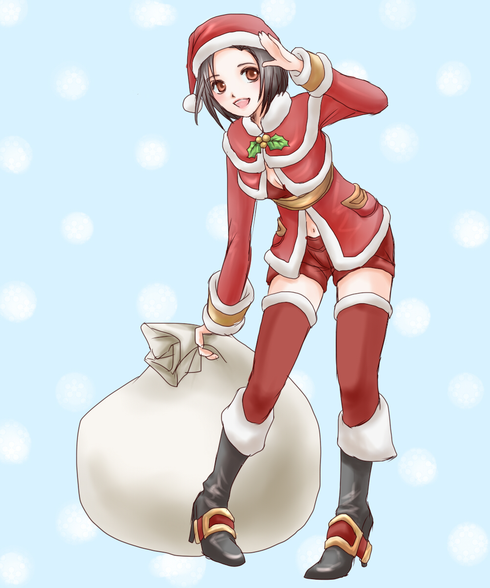 1girl :d adventurer_(ff11) black_boots black_hair blue_background boots breasts capelet christmas cleavage final_fantasy final_fantasy_xi full_body fur-trimmed_capelet fur-trimmed_headwear fur-trimmed_legwear fur-trimmed_thighhighs fur_trim hat high_heel_boots high_heels highres holding holding_sack holly hume knee_boots long_sleeves medium_breasts navel open_mouth orange_eyes pigeon-toed polka_dot polka_dot_background red_capelet red_hat red_shorts red_thighhighs sack sakutsuki santa_hat short_hair short_shorts shorts smile solo thighhighs