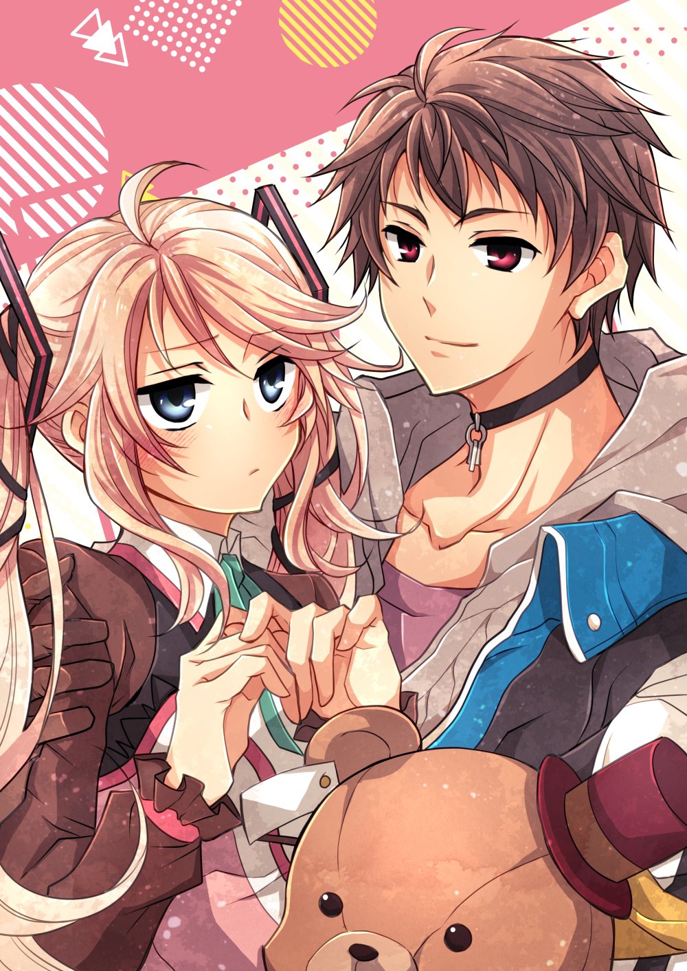 1boy 1girl blue_eyes blush brown_hair choker eiyuu_densetsu hat highres holding_hands jacket kuro_no_kiseki kuro_no_kiseki_(series) kuro_no_kiseki_i kuro_no_kiseki_ii looking_at_viewer nadia_rayne pink_hair red_eyes satsuki_(chaosmode) smile stuffed_animal stuffed_toy swin_abel teddy_bear top_hat twintails