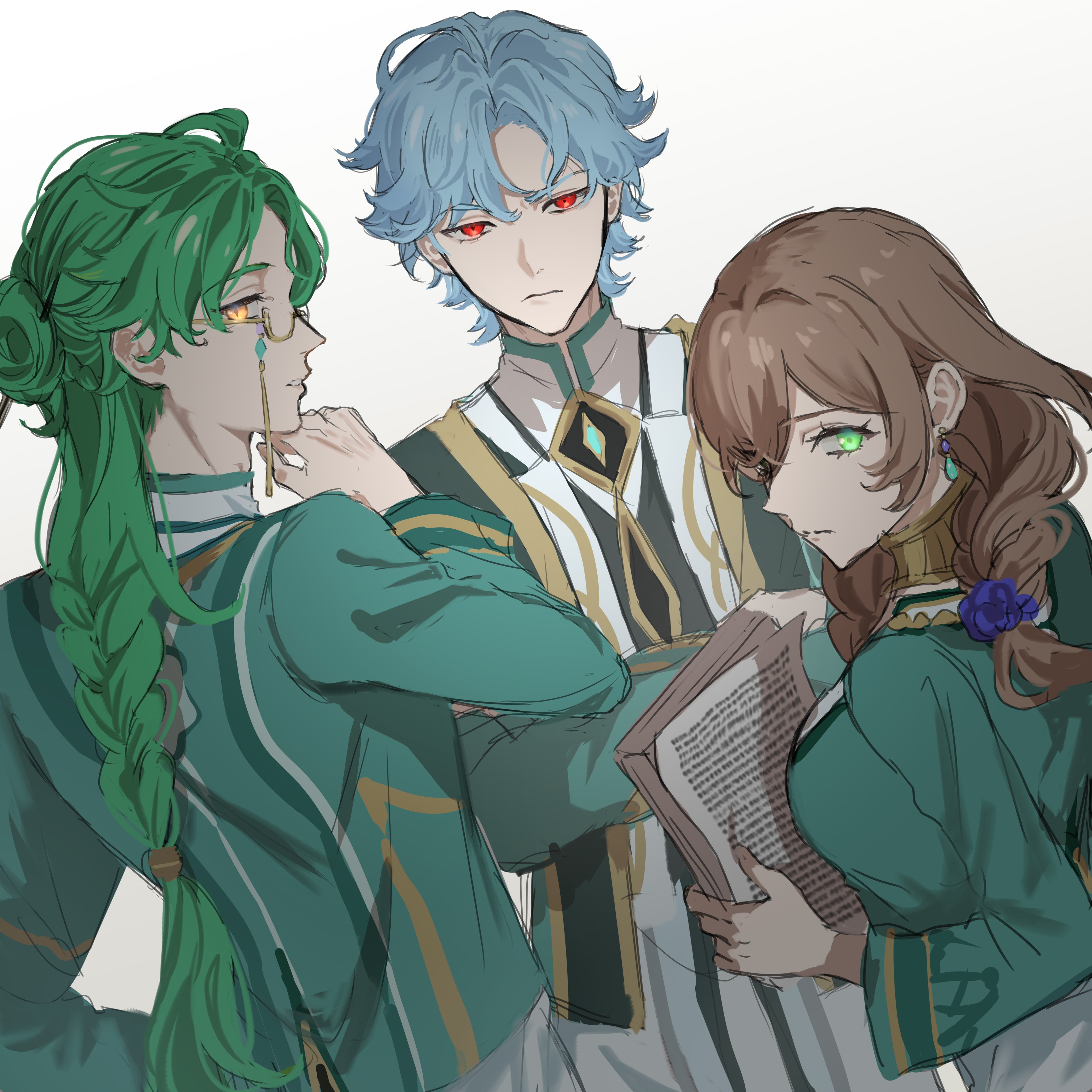 1girl 2boys absurdres ahoge alternate_costume baizhu_(genshin_impact) blue_hair book braid breasts brown_hair crossed_arms dottore_(genshin_impact) dress earrings eyebrows_hidden_by_hair genshin_impact glasses glowing glowing_eyes green_dress green_eyes green_hair hand_on_own_cheek hand_on_own_face highres holding holding_book jewelry large_breasts lisa_(genshin_impact) long_hair long_sleeves looking_at_viewer multiple_boys serious short_hair simple_background upper_body white_background yamabuki0211 yellow_eyes