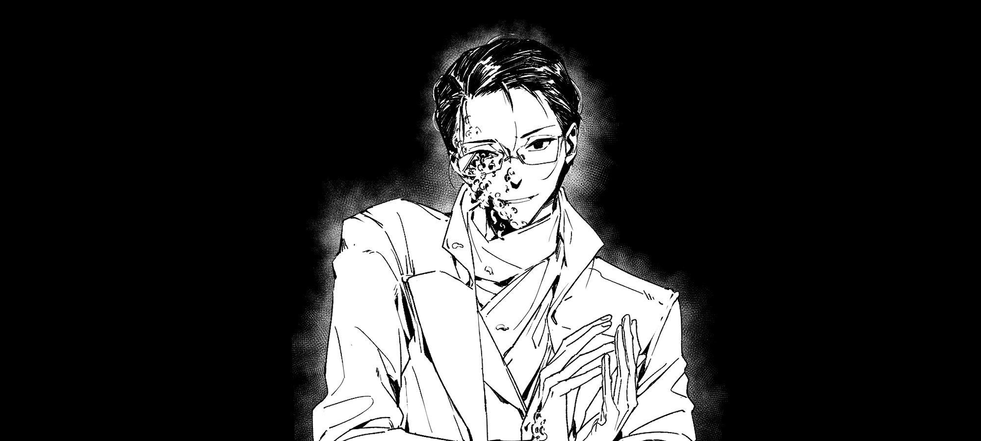 0000-111-0100-0 1boy aura black_background chinese_commentary commentary_request dark empty_eyes gehrman_sparrow glasses highres jacket klein_moretti looking_at_viewer lord_of_the_mysteries male_focus monochrome mutation nail_(hardware) own_hands_together parted_lips scarf short_hair simple_background smile solo