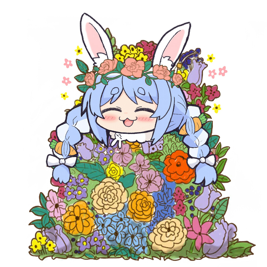 1girl animal_ears blue_flower blue_hair blush_stickers bow braid closed_eyes flower hololive leaf long_hair matarou_(matarou072) midsommar open_mouth pink_flower purple_flower rabbit_ears rabbit_girl red_flower solo twin_braids usada_pekora virtual_youtuber white_background white_bow yellow_flower