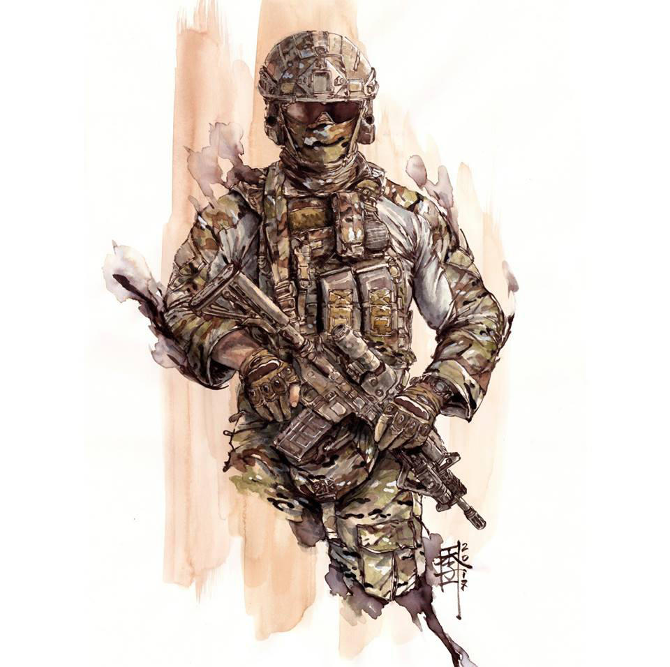1other 2017 ambiguous_gender ammunition_pouch angled_foregrip assault_rifle australia body_armor brown_gloves brown_headwear brown_pants brown_shirt buckle camouflage camouflage_headwear camouflage_jacket camouflage_pants camouflage_shirt combat_helmet commentary covered_face covered_mouth cowboy_shot cropped_legs english_commentary explosive facing_viewer gloves grenade gun helmet holding holding_gun holding_weapon jacket japanese_text load_bearing_vest long_sleeves m4_carbine magazine_(weapon) making-of_available mar-c! military_operator multicolored_shirt optical_sight original other_focus painting_(medium) pants partially_fingerless_gloves bulletproof_vest pocket pouch rifle shirt signature snap-fit_buckle solo sunglasses tactical_clothes traditional_media watercolor_(medium) weapon