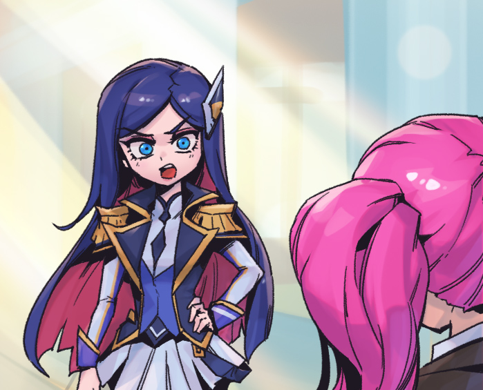 2girls :o arm_at_side battle_academia_caitlyn blue_eyes blue_vest caitlyn_(league_of_legends) colored_inner_hair cowboy_shot grey_shirt grey_skirt hair_ornament hand_on_own_hip jacket league_of_legends long_hair long_sleeves lux_(league_of_legends) miniskirt multicolored_hair multiple_girls open_clothes open_jacket phantom_cross pink_hair purple_hair red_hair shirt skirt teeth twintails two-tone_hair upper_teeth_only vest