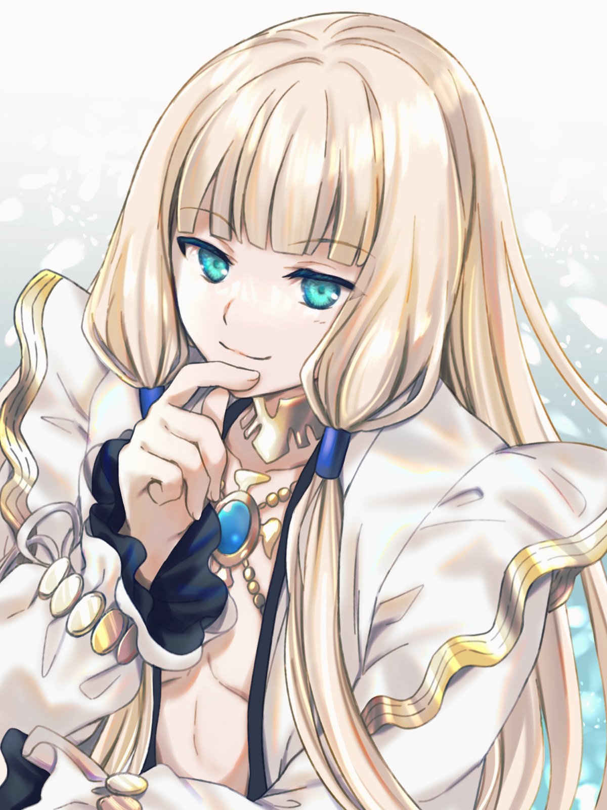 1boy aqua_eyes blonde_hair blush closed_mouth collarbone fate/grand_order fate_(series) hand_to_own_mouth hand_up highres long_hair long_sleeves looking_at_viewer male_focus noah_(third_ascension)_(fate) open_clothes open_shirt puffy_long_sleeves puffy_sleeves shirt sidelocks smile solo tachitsu_teto upper_body very_long_hair white_shirt
