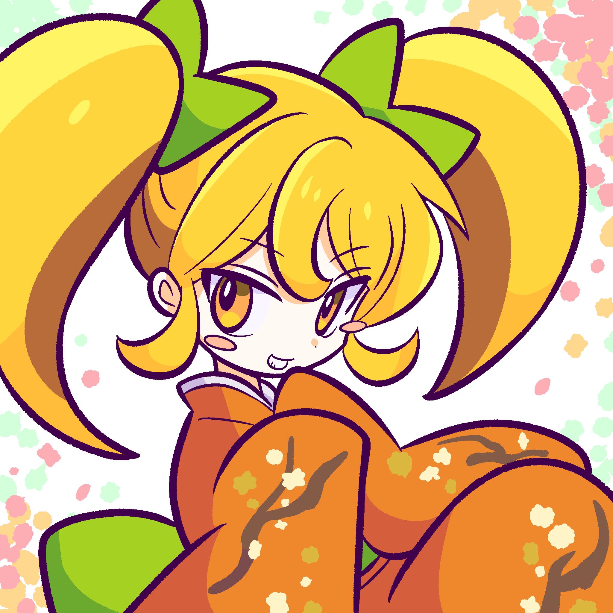 1girl blonde_hair bow cat_hair_ornament danganronpa_(series) danganronpa_2:_goodbye_despair grin hair_bow hair_ornament hichimochi_(4gdq1cyagsnyqqz) highres japanese_clothes kimono long_hair long_sleeves looking_at_viewer looking_to_the_side multicolored_background saionji_hiyoko sleeves_past_fingers sleeves_past_wrists smile solo teeth twintails
