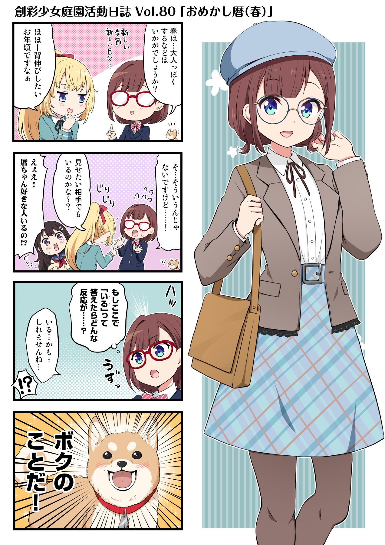 3girls 4koma adjusting_hair asymmetrical_bangs bag belt black_ribbon blazer blonde_hair blue_eyes blue_headwear blue_jacket blue_sailor_collar blue_skirt blush bow bowtie brown_hair brown_pantyhose collar collared_shirt comic dog emphasis_lines flying_sweatdrops glasses green_jacket grey_jacket hair_bow hair_ornament hairclip hand_on_own_chin highres index_finger_raised jacket lace-trimmed_jacket legs long_sleeves looking_at_viewer multiple_girls neck_ribbon neckerchief notice_lines official_art opaque_glasses open_mouth pantyhose plaid_clothes plaid_skirt pointing pointing_at_another ponytail ragho_no_erika red-framed_eyewear red_bow red_bowtie red_neckerchief ribbon round_eyewear saeki_ritsuka sailor_collar school_uniform shirt short_hair short_twintails shoulder_bag skirt sleeves_past_wrists smile sousai_shoujo_teien sparkle striped_background striped_bow striped_bowtie striped_clothes sweatdrop sweater takanashi_koyomi thighs twintails vertical_stripes white_shirt yuki_madoka