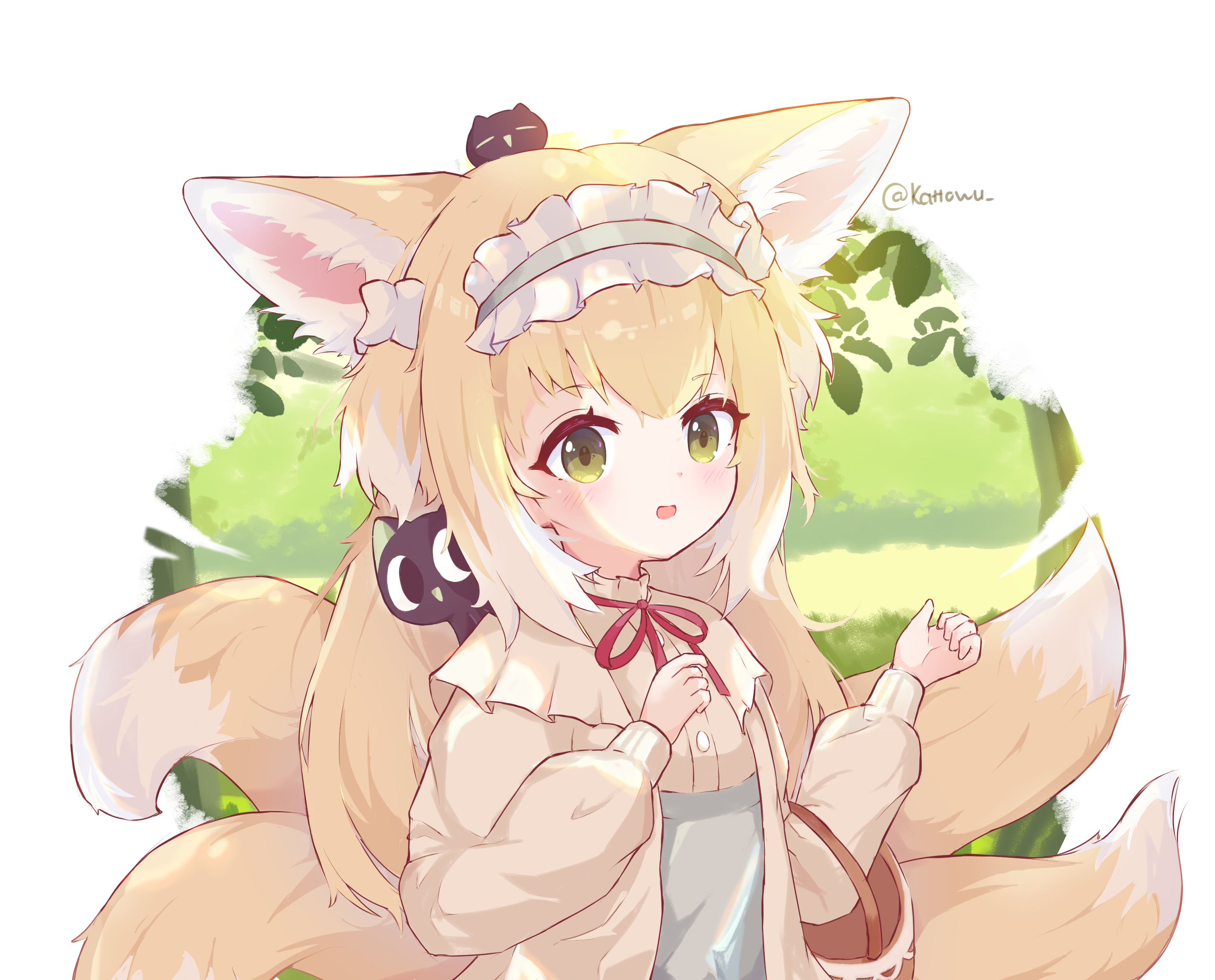 1girl animal animal_ear_fluff animal_ears arknights basket black_cat blonde_hair blue_hairband blue_skirt cardigan cat commentary crossover fox_ears fox_girl fox_tail frilled_hairband frills green_eyes hair_between_eyes hairband heixiu highres kattowu kitsune kyuubi light_blush long_hair long_sleeves luo_xiaohei multiple_tails neck_ribbon official_alternate_costume on_head open_cardigan open_clothes parted_lips puffy_long_sleeves puffy_sleeves red_ribbon ribbon shirt simple_background skirt suzuran_(arknights) suzuran_(spring_praise)_(arknights) tail luo_xiaohei_zhanji twitter_username upper_body white_background yellow_cardigan yellow_shirt