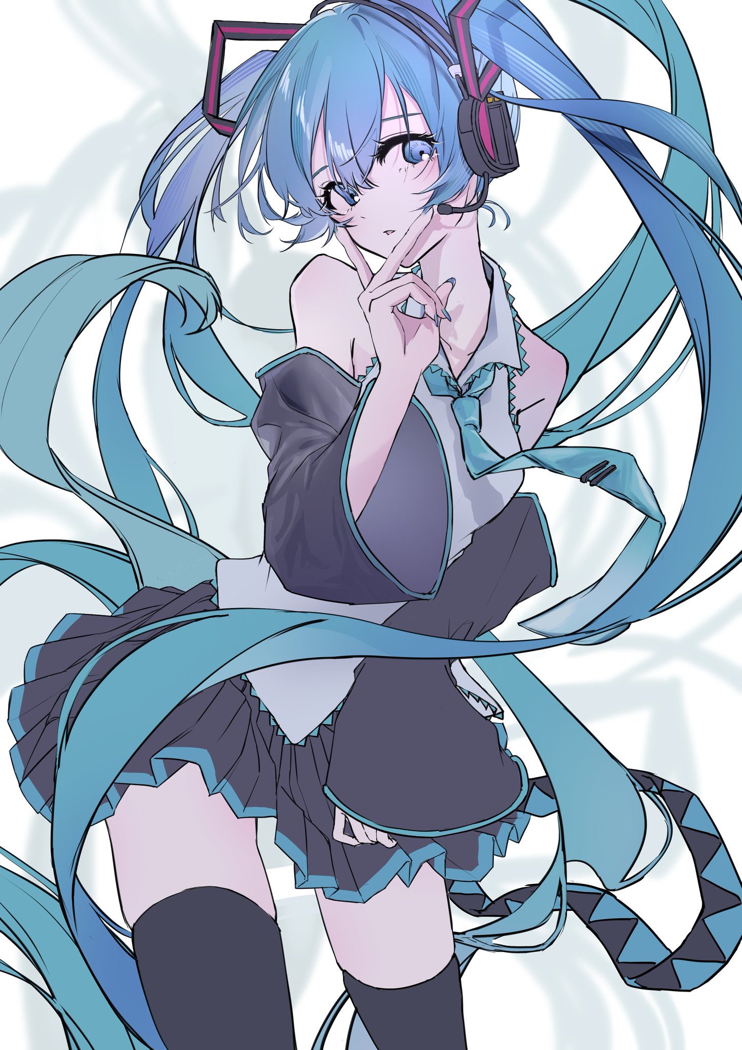 1girl aqua_eyes aqua_hair aqua_nails aqua_necktie bare_shoulders black_skirt black_theme collared_shirt commentary cowboy_shot detached_sleeves hatsune_miku head_tilt headset highres long_hair looking_at_viewer meso_potamia miku_day necktie parted_lips pleated_skirt shirt skirt solo vocaloid white_shirt