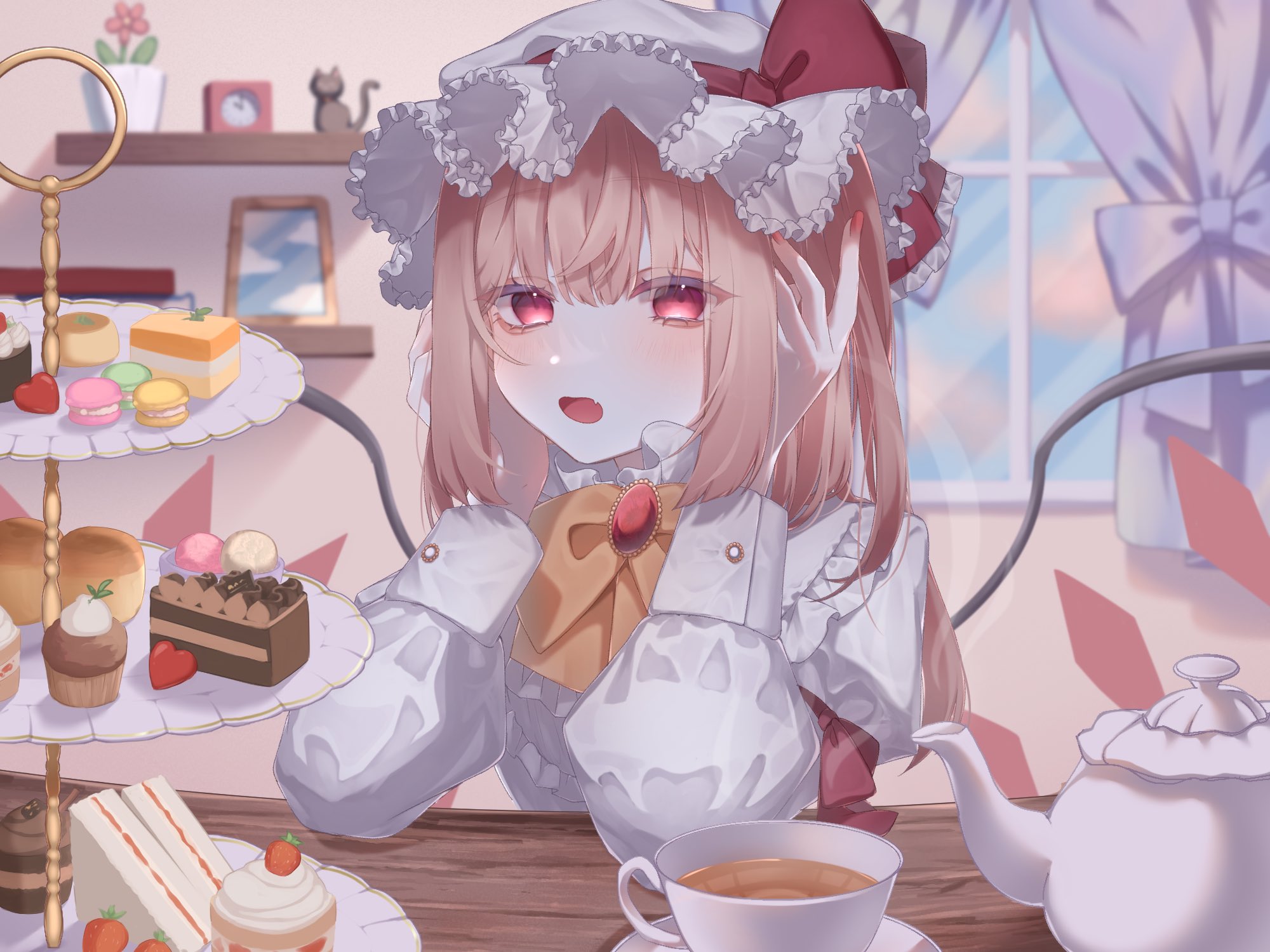 1girl blonde_hair bow cake cake_slice cup flandre_scarlet food hat highres hisu_(hisu_) jacket long_sleeves looking_at_viewer macaron mob_cap open_mouth red_bow red_eyes red_jacket shirt solo tea tea_party teacup tiered_tray touhou white_hat white_shirt window yellow_bow